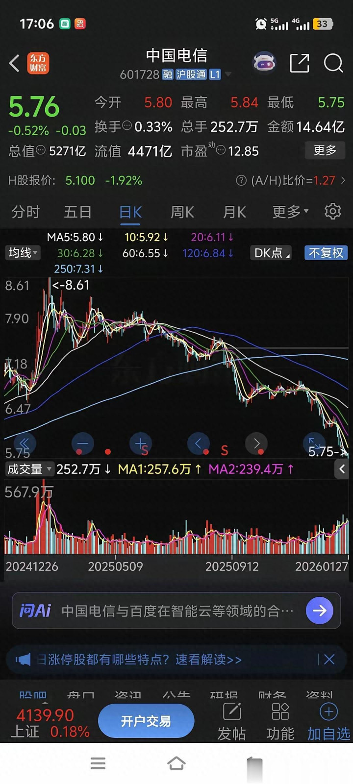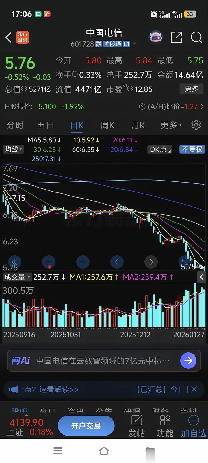 明明是手握国家战略资源的超级巨头,明明身处所谓的“牛市”氛围,股价却像坐了滑梯一样,一路向下探底。5.76元的收盘价,不仅创下了近期的新低,更把那些怀着“价值投资”梦想进场的散户和机构,杀得片甲不留。